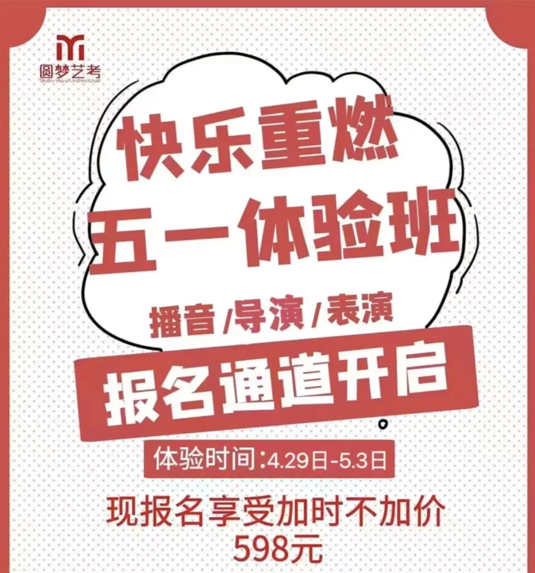 国庆集训火热报名中(一)开课时间:10月1日(9月29日/30日报到)(二)开设专业:(1)播音:自我介绍、语音基础、新闻播读、即兴评述、模拟主持、稿件朗读;(2)编导:即兴评述、