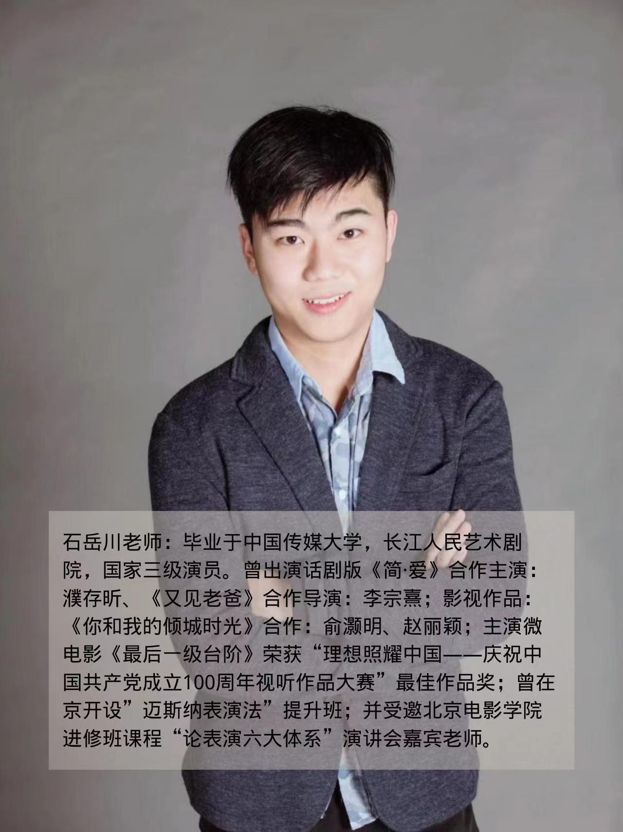 石岳川老师:毕业于中国传媒大学,长江人民艺术剧院,国家三级演员。曾出演话剧版《简·爱》合作主演:濮存昕、《又见老爸》合作导演:李宗熹;影视作品:《你和我的倾城时光》合作:俞灏明、赵丽颖;主演微电影《最后一级台阶》荣获“理想照耀中国--庆祝中国共产党成立100周年视听作品大赛”最佳作品奖;曾在京开设”迈斯纳表演法”提升班;并受邀北京电影学院进修班课程“论表演六大体系”演讲会嘉宾老师。