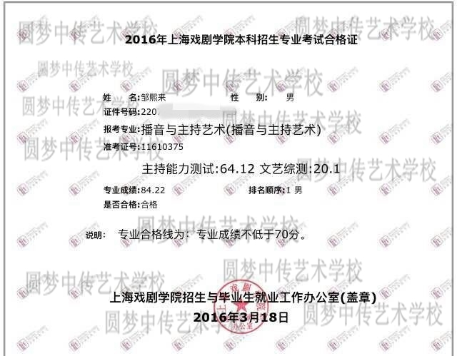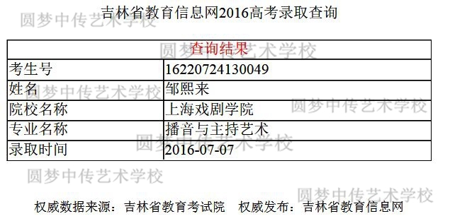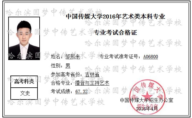 邹熙来(吉林榆树实验高中):上海戏剧学院(播音主持)全国第一名,中国传媒大学(播音主持艺术)合格证,东北师范大学(播音主持艺术)合格证。现已被上海戏剧学院(播音主持)录取.