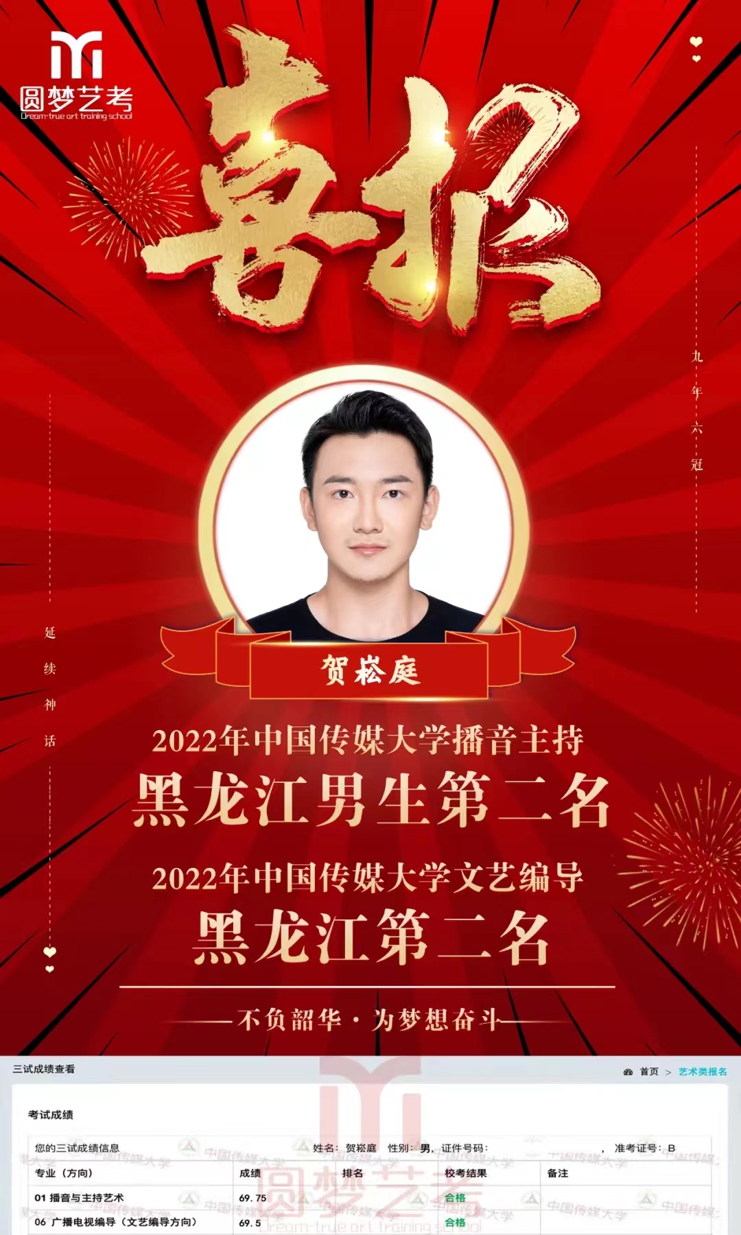 贺崧庭22年中国传媒大学播音主持黑龙江男生第二名22年中国传媒大学文艺编导黑龙江第二名