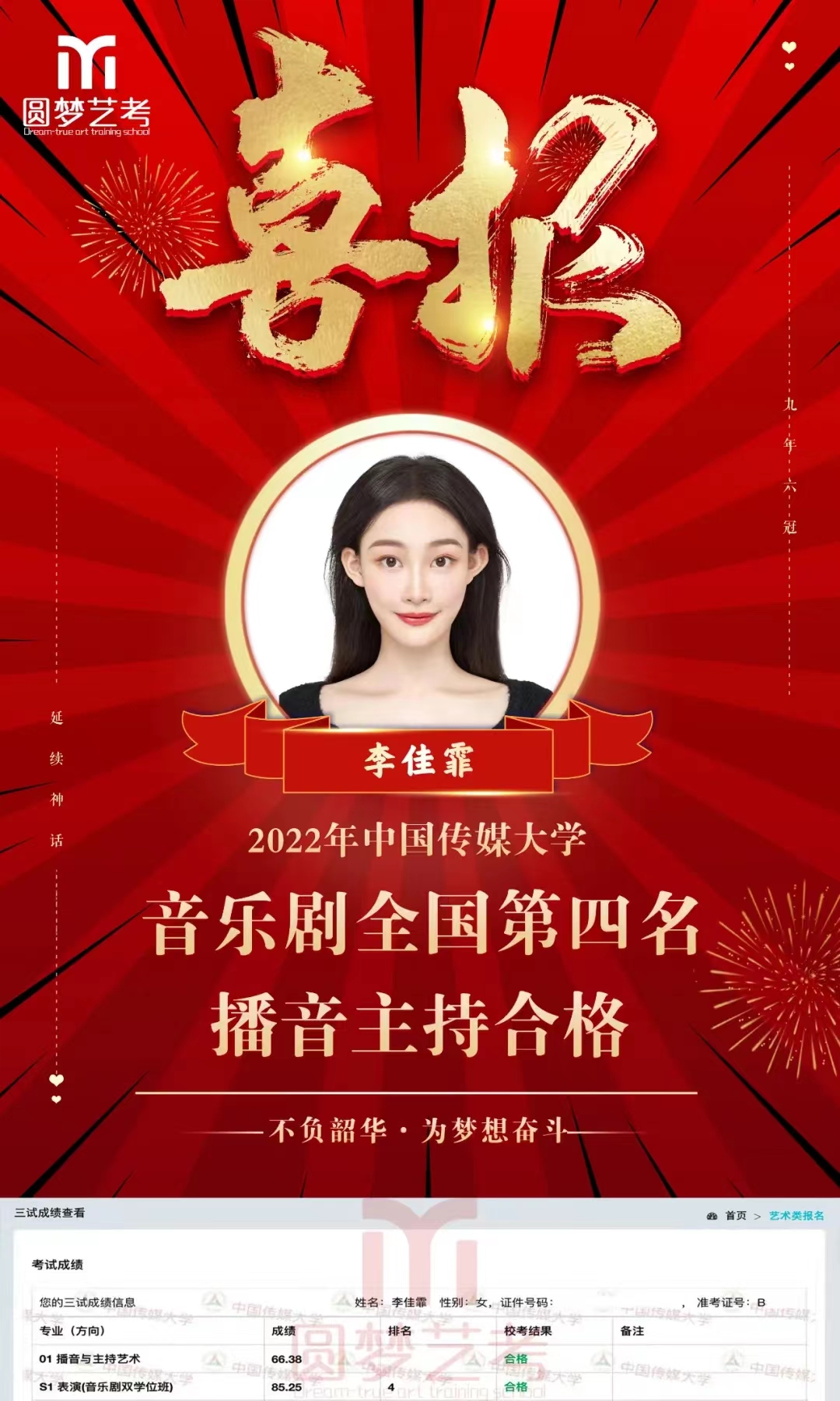 李佳霏 22年中国传媒大学 音乐剧全国第四名 播音主持合格
